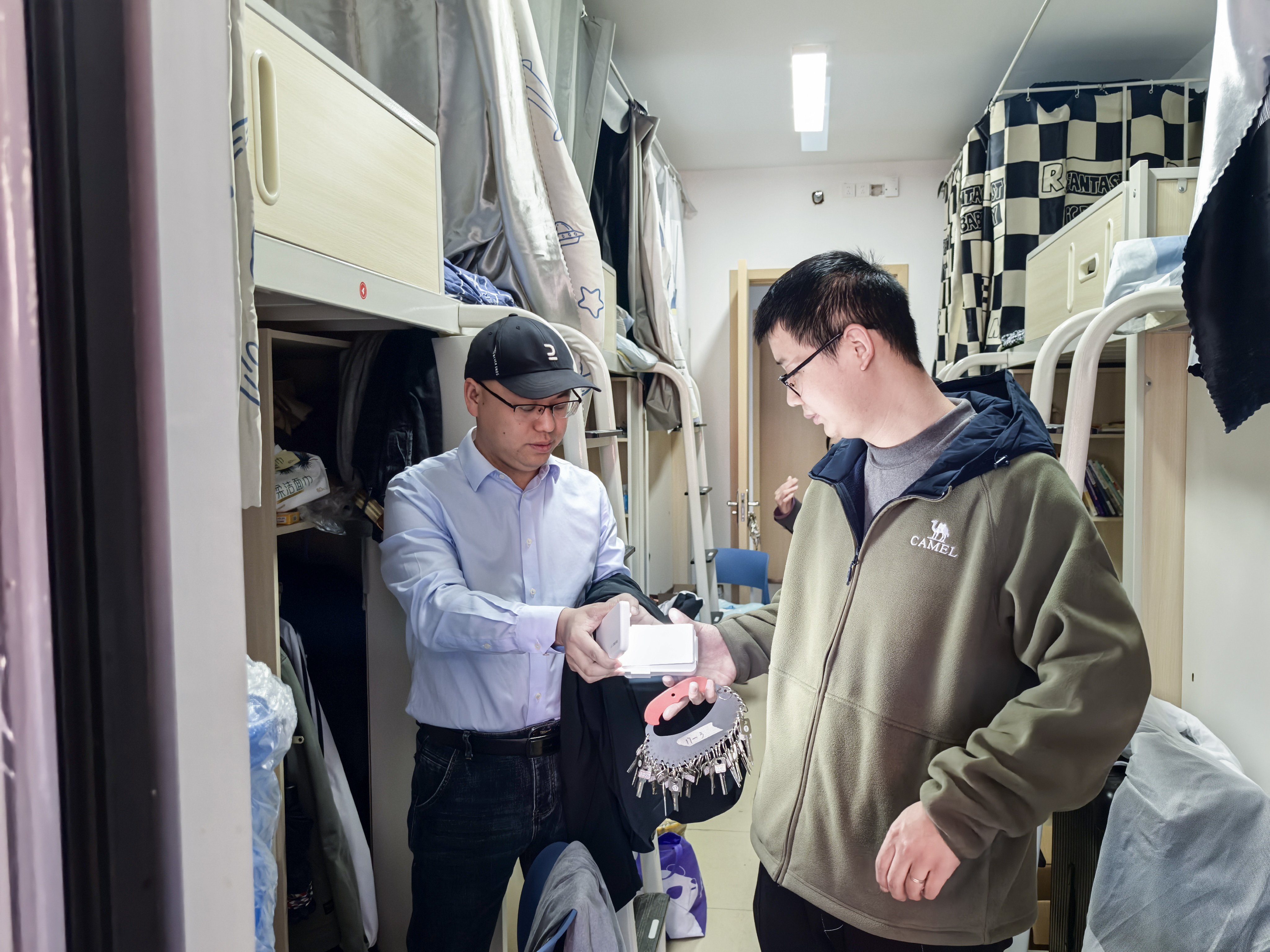 检查中逐间走访宿舍,严查违规电器、插线板上床、私拉电线等问题,现场整改并处理宿舍内的安全隐患。贺元烨强调“安全无小事,须防患于未然”。针对禁烟管理,通过询问和检查确认宿舍有无吸烟痕迹,重申集体空间健康责任。此外,结合员工反馈,严查宿舍楼内推销、代购等违规行为,警示员工远离线上线下诈骗陷阱,严禁未经批准在校内进行商业活动。