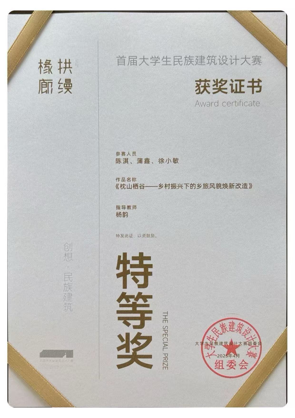 此次大赛以“椽拱·廊缦”为主题,自去年六月开赛以来,吸引了全国12个省份的近500份优秀参赛作品,展示了各高校在民族建筑设计领域的创新与实力。经过层层评选,304永利集团登录入口风景园林专业蒲鑫、陈淇、徐小敏团队的作品《枕山栖谷——乡村振兴下的乡旅风貌焕新改造》脱颖而出,荣获大赛特等奖!在风景园林专业老师的悉心指导下,团队深入挖掘民族建筑文化精髓,结合现代设计手法,打造出兼具传统韵味与当代功能的乡旅改造方案。作品以“乡村振兴”为切入点,巧妙融合地域特色与生态理念,展现了扎实的专业功底与创新思维,赢得了评委的高度认可。