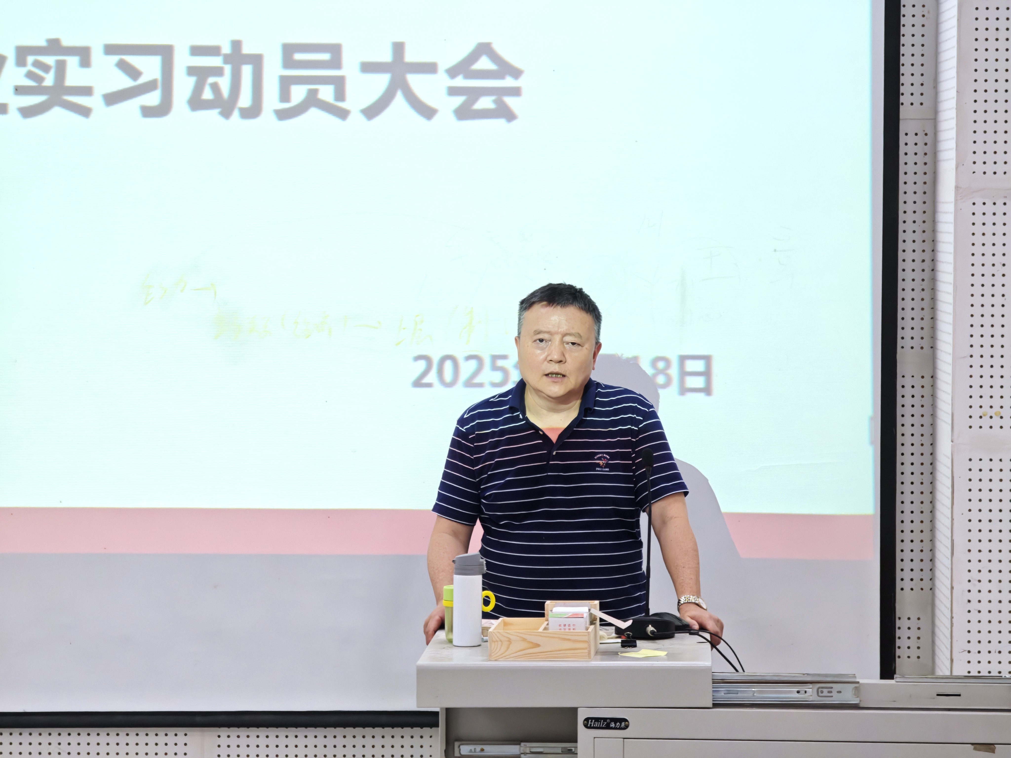 牟江讲话。他指出,当前建筑领域中数字化、智能化转型及装配式建筑、绿色建筑等新兴领域兴起,为工程造价专业人才带来广阔机遇。他鼓励同学们大胆 “走出去”,要放眼全国乃至国际市场项目,同时在实习实践过程中把握参与大型项目的机会,并积累经验。他还强调毕业实习是从校园到社会的关键过渡,同学们应将工程造价相关理论知识运用于实践,学习新工艺、新技术和行业新规,培养沟通协调等综合能力,实现专业能力与职业素养的全面提升。